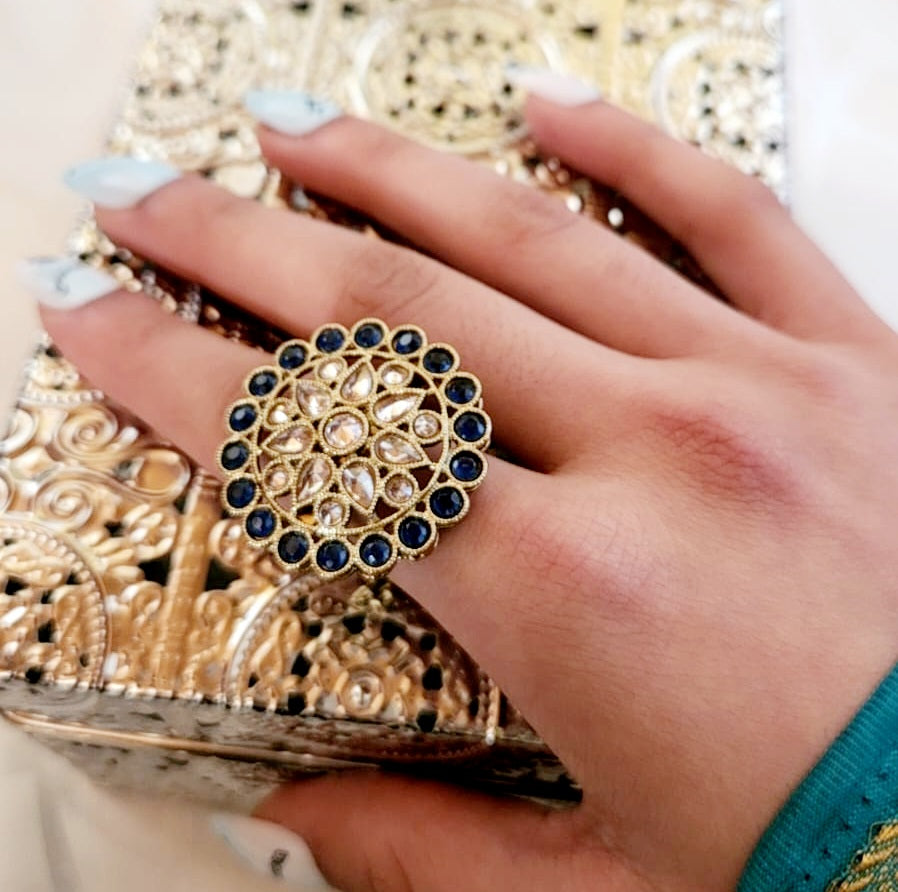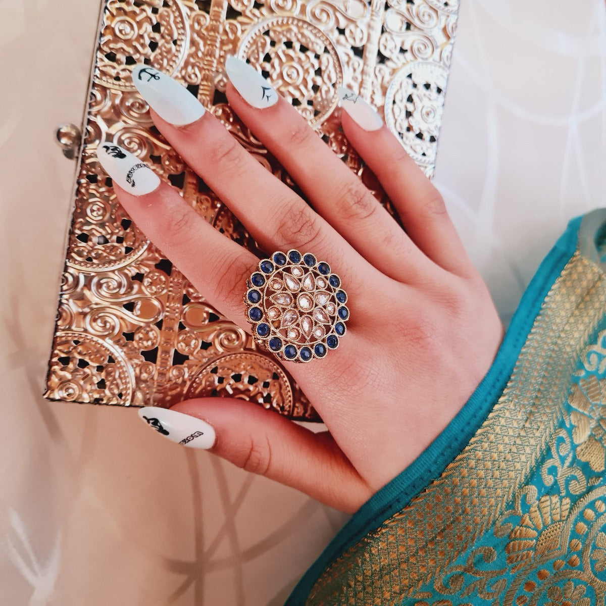 Dieser elegante Ring mit blauen und weißen Steinen verfügt über eine goldene Metallfassung mit weißen Steinen in der Mitte und dunkelblauen Steinen an der Außenseite. Der Ring ist auf jede Größe verstellbar, perfekt für jeden Anlass.