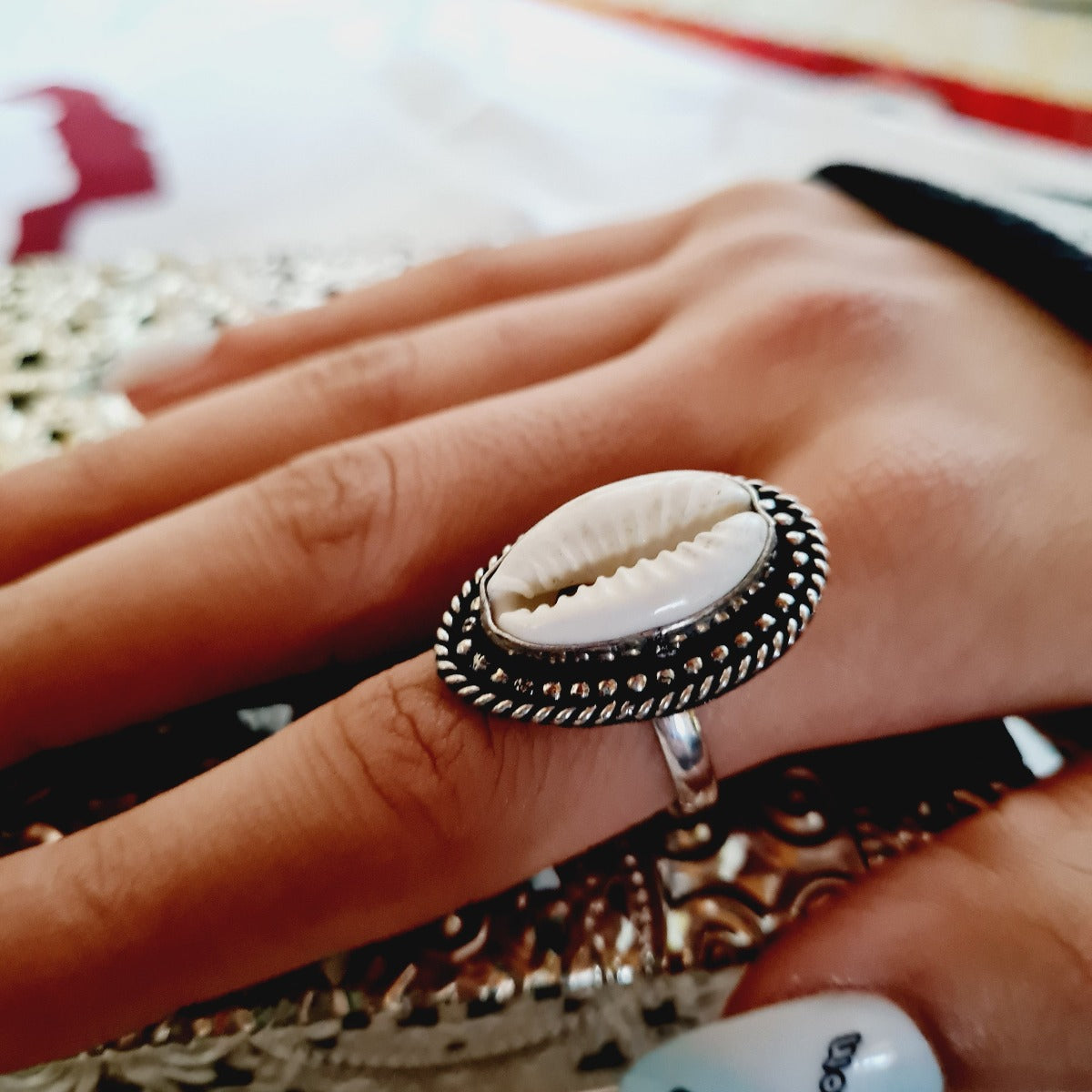 Dieser oxidierte Kauri-Muschel-Ring verleiht jedem Outfit eine schöne und einzigartige Note. Das aus oxidiertem Silbermetall gefertigte verstellbare Design verfügt über eine echte Kaurimuschel in der Mitte, die perfekt für einen Hauch von Bohème-Flair sorgt.