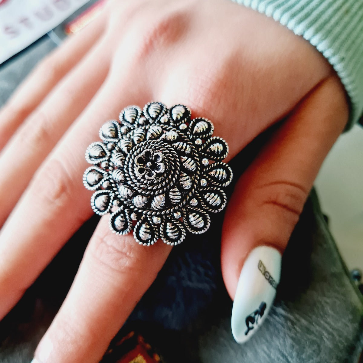 This stylish oxidised ring features a small flower design in the center and is adjustable for a perfect fit. Whether you're heading to a party or a formal event, this ring makes a great fashion accessory.